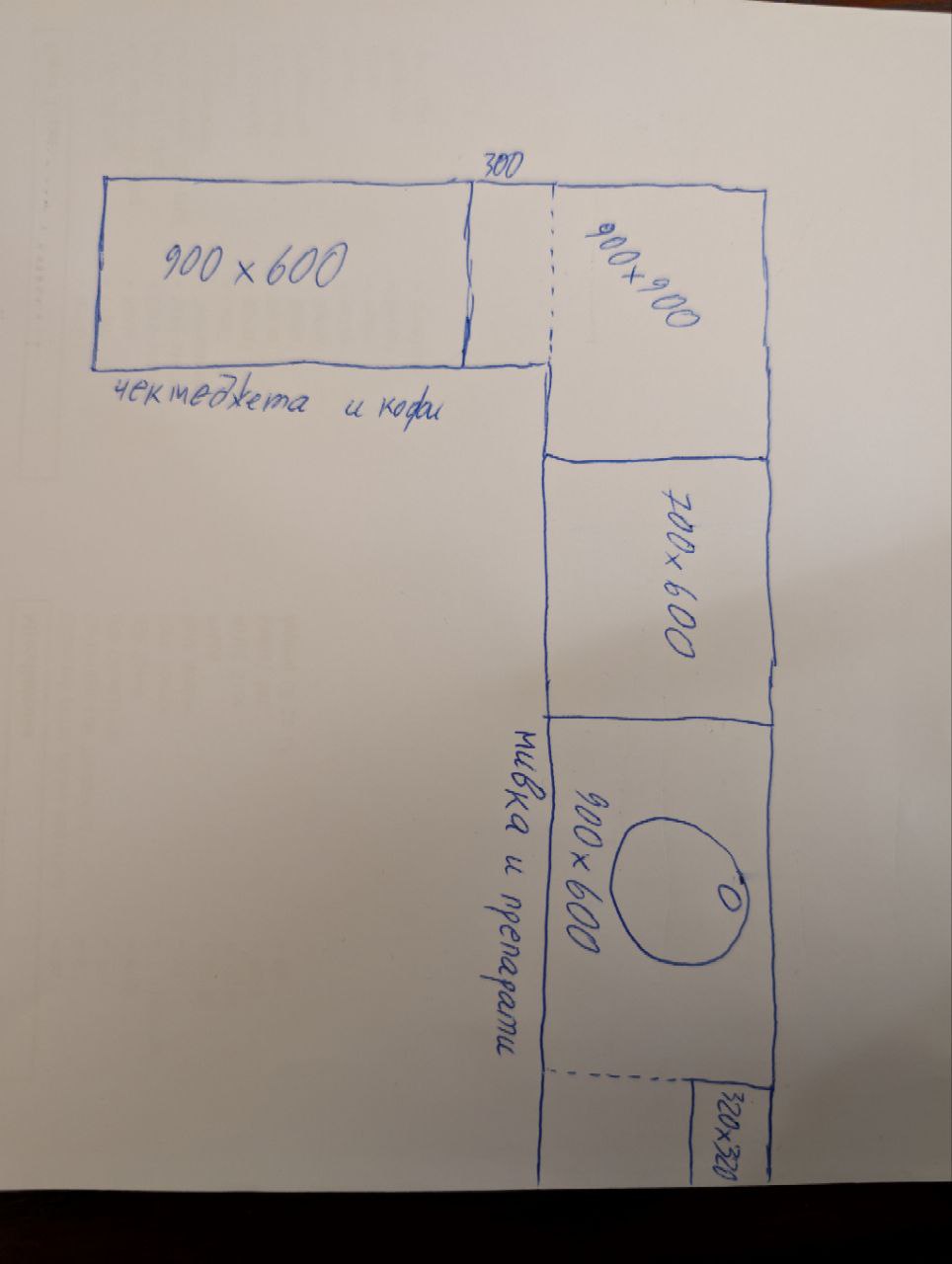 - създаване на цялостен ъглов плот, включва два стандартни шкафа (височина, дължина – 90см, дълбочина – 60 см) + custom ъглов шкаф.